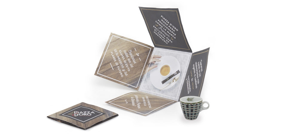 Realización de un desplegable con el objetivo de presentar la marca a los bares de calidad de las grandes ciudades. Se busca transmitir el carácter moderno y cálido de Piazza D’Oro además de su alta calidad de producto.